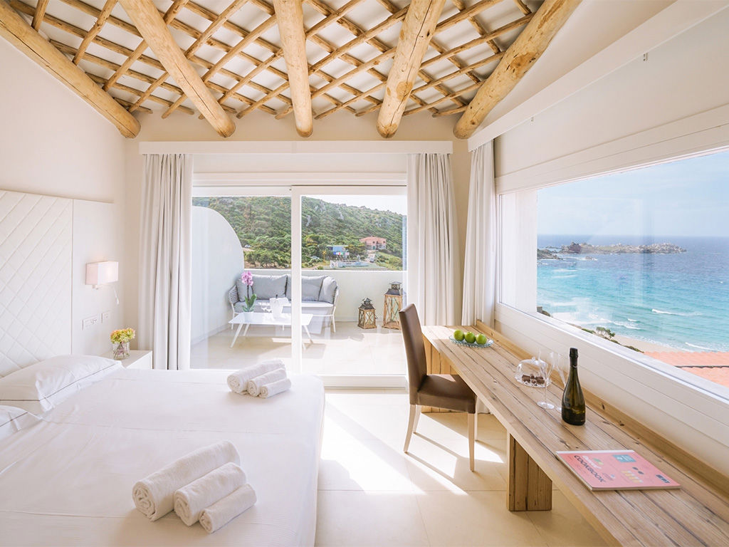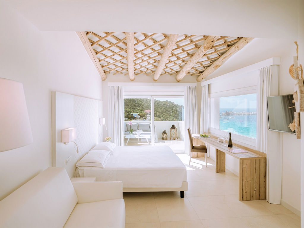 La camera è caratterizzata da una parete a vetro con splendida vista panoramica sul mare, ideale per vivere momenti romantici e di totale privacy.